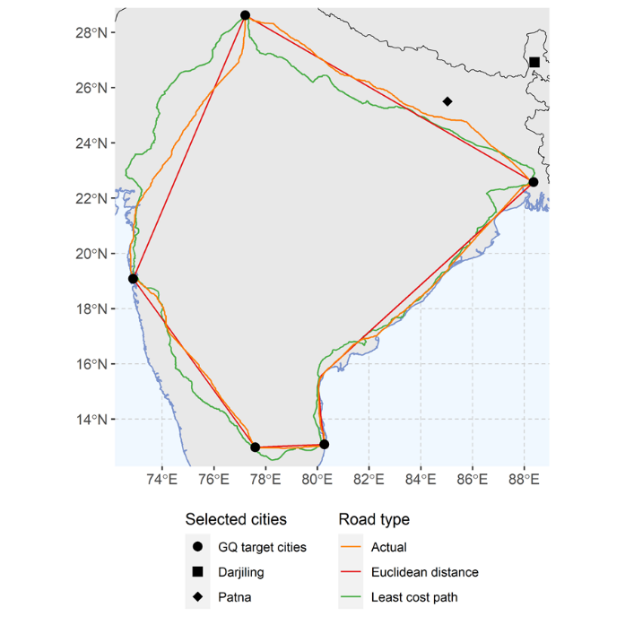 दूसरा, हम आकृति-1 में जीक्यू नेटवर्क से प्रेरित एक 'अमहत्वपूर्ण स्थान' के आधार पर अनुसंधान डिज़ाइन का उपयोग करते हैं। उदाहरण के लिए, तथ्य यह है कि पटना (बिहार राज्य में) से जीक्यू की दिल्ली-कोलकाता राजमार्ग-खंड की दूरी दार्जिलिंग (पश्चिम बंगाल राज्य में) से काफी कम इसलिए नहीं है  कि जीक्यू का लक्ष्य पटना की आर्थिक क्षमता को बढ़ाना या पटना में गरीबों की मदद करना था। इसलिए, पटना के संदर्भ में बाज़ारों में बेहतर प्रदर्शन प्रासंगिक है। हालाँकि, जीक्यू का वास्तविक पथ निर्धारण उसके न्यूनतम लागत-मार्ग से इधर-उधर हो सकता है और यह इसके पीछे के राजनीतिक कारणों को दर्शाता है। हम वास्तविक मार्ग की ऐसी संभावित अंतर्जातता से बचने के लिए, अपने अध्ययन में नोडल शहरों को जोड़ने वाले काल्पनिक रैखिक मार्ग का उपयोग करते हैं। हम एक साधन चर(IV) यानी इंस्ट्रुमेंटल वेरिएबल दृष्टिकोण3 का उपयोग करते हैं ताकि हम जिलों में बाज़ार पहुँच में भिन्नता के केवल उस हिस्से का उपयोग कर सकें, जो ऐतिहासिक रेलमार्गों और निकटतम जीक्यू आर्म की दूरी से परिणामित होता है और इस प्रकार किसी भी संभावित अंतर्जातता को दूर कर सकें।