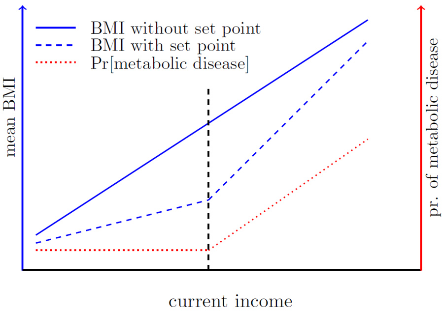 यदि आय, बीएमआई, और चयापचय संबंधी रोग के बारे में डेटा पुर्वाधुनिक काल से लेकर कई पीढ़ियों में प्रत्येक वंश (घर) के सन्दर्भ में उपलब्ध होते, तो हम सीधे पूर्ववर्ती तर्क की जाँच कर सकते थे। किसी एक वंश में ऐसी कोई एक विशेष पीढ़ी होगी जिसमें बीएमआई में वृद्धि और चयापचय संबंधी रोग की जोखिम के साथ ही वर्तमान आय और पैतृक आय के बीच का अंतर एक सीमा से अधिक हो गया होगा। इस तरह के बहु-पीढ़ी पारिवारिक स्तर के आंकड़ों के अभाव में, हम विकास की प्रक्रिया के दौरान आबादी में आय के विकास की विशेषता को ध्यान में रखे हुए, वर्तमान आय के आधार पर नवल परीक्षण करते हैं। पीढ़ी-दर पीढ़ी आय वितरण का विकास किस प्रकार से होता है, इस बारे में संभाव्य धारणा बनाते हुए हमारा मॉडल किसी भी समय निम्नलिखित निहितार्थ उत्पन्न करता है, जैसा कि चित्र 1 में वर्णित है: (i) यद्यपि वर्तमान पारिवारिक आय में बीएमआई (नीली धराशायी रेखा) सभी स्तरों से बढ़ रही है, जैसे-जैसे हम क्षैतिज अक्ष के साथ आगे बढ़ते हैं, इस संबंध में एक विशेष आय स्तर (काली धराशायी ऊर्ध्वाधर रेखा द्वारा इंगित) पर एक किंक (ढलान असंतुलन) होता है; (ii) चयापचय संबंधी रोग (लाल धराशायी रेखा) की संभावना समान आय स्तर से नीचे स्थिर है और उसके बाद बढती है।