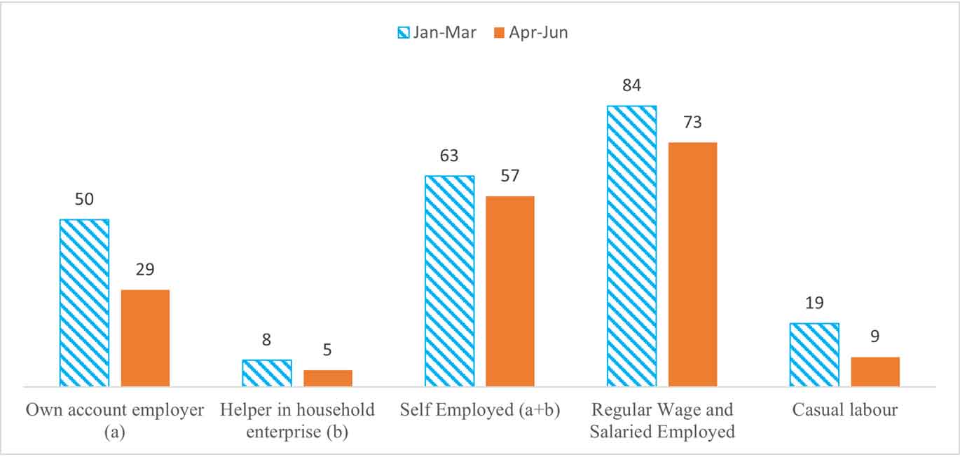 उद्योग तथा रोजगार की व्यापक स्थिति के अनुसार रोजगार अनुमान के आंकड़े आकृति-2 और 3 में प्रस्तुत किये गए हैं। अनुमान के अनुसार, जनवरी-मार्च 2020 तिमाही में लगभग 16.6 करोड़ लोगों को रोजगार मिला हुआ था। अप्रैल-जून 2020 में, पिछली तिमाही की तुलना में रोजगार में गिरावट लगभग 2.6 करोड़ रही, जिसमें 1.9 करोड़ पुरुष और 70 लाख महिलाएं थी (आकृति-1)। वहीं शहरी कृषि क्षेत्र में पिछली तिमाही की तुलना में अप्रैल-जून 2020 में नियोजित व्यक्तियों की संख्या में कोई बदलाव नहीं होने के कारण शहरी कृषि क्षेत्र स्थायी बना रहा। जबकि, द्वितीयक और तृतीयक क्षेत्रों में नौकरीयो का नुकसान हुआ (आकृति-2)। इससे सबसे ज्यादा प्रभावित सामान्य श्रमिक हुए। लॉकडाउन से पहले की तिमाही के दौरान नियोजित लगभग 1.9 करोड़ श्रमिकों में से लगभग 90 लाख ने अप्रैल-जून 2020 के दौरान अपनी नौकरी खो दी (आकृति- 3)। ‘आकृति-नियमित वेतन और वेतनभोगी’ श्रेणी में 1 करोड़ और ‘स्व-नियोजित' श्रेणी में लगभग 60 लाख लोगों की नौकरियाँ खत्म हो गयी। इनमें से कुछ को हो सकता है कि लॉकडाउन के कारण नौकरी छोड़ने को मजबूर किया गया हो और हो सकता है कि कुछ ने कोविड -19 के डर के कारण स्वेच्छा से ऐसा किया हो।