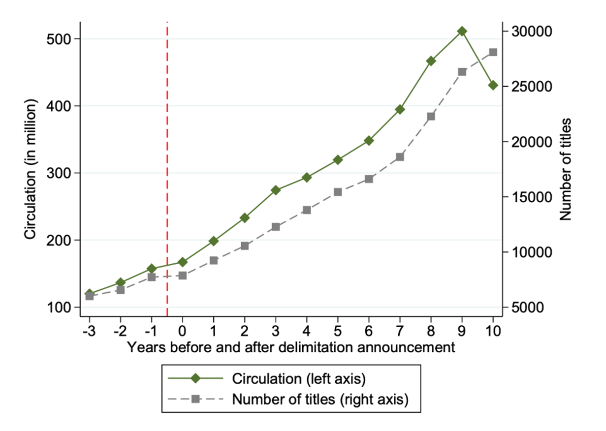 भारत में अत्यधिक राजनीतिकरण वाले समाचार पत्र मीडिया बाज़ार के गुणात्मक साक्ष्य के अनुरूप, हम उन क्षेत्रों में समाचार पत्रों की आपूर्ति में पर्याप्त वृद्धि पाते हैं, जिन्हें परिसीमन के कारण चुनावी महत्त्व प्राप्त हुआ। हम उन बाज़ारों में समाचार पत्रों की संख्या और समाचार पत्र के प्रसार, दोनों में वृद्धि को दर्ज करते हैं जिनका चुनावी महत्त्व होता है। यह वृद्धि लगभग तत्काल है, भले ही अधिकांश स्थानों पर चुनाव अभी भी कई साल के बाद होने वाले थे और यह वृद्धि परिसीमन की घोषणा के बाद दस साल की अवधि में भी जारी है।