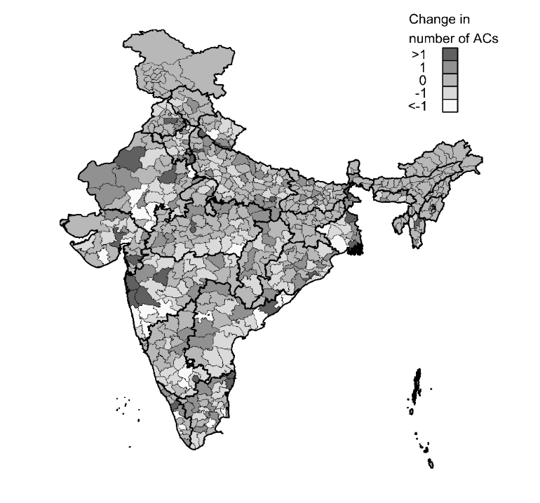 हालाँकि, परिसीमन का भारतीय प्रशासनिक जिलों के चुनावी महत्त्व पर महत्त्वपूर्ण प्रभाव पड़ा। आकृति-2 चुनावी निर्वाचन क्षेत्रों की संख्या में बदलाव को दर्शाती है, जिसका परिसीमन के परिणामस्वरूप प्रत्येक भारतीय जिले से चुने जाने वाले विधायकों की संख्या पर प्रभाव पड़ता है- कुछ जिलों में एक या कई निर्वाचन क्षेत्र कम हो गए जबकि अन्य जिलों में कुछ बढ़ गए। इसलिए राज्य-वार मसौदा परिसीमन रिपोर्ट का प्रकाशन प्रशासनिक जिलों के चुनावी महत्त्व के लिए एक बहिर्जात झटका माना जा सकता है। चूँकि जिलों में जनसंख्या या शिक्षा स्तर में परिवर्तन जैसे मीडिया के खपत सम्बन्धी अन्य सभी निर्धारक समय के साथ धीरे-धीरे आगे बढ़ रहे हैं, किसी जिले के चुनावी महत्त्व में अचानक हुए परिवर्तन के चलते हम समाचार मीडिया की जिला स्तरीय आपूर्ति पर पडने वाले चुनावी महत्त्व में परिवर्तनों के कारण-प्रभाव को अलग कर पाते हैं।