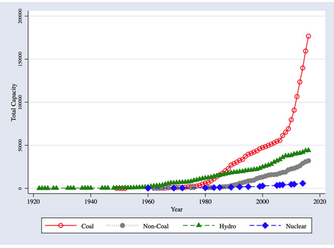 हमारा मुख्य उद्देश्य एनीमिया की घटनाओं के संदर्भ में कोयला आधारित बिजली उत्पादन और उससे जुड़े वायु प्रदूषण के हानिकारक प्रभावों को समझना है। हम बच्चों और महिलाओं की एनीमिया की स्थिति पर कोयला-प्रेरित प्रदूषण के प्रभावों की जांच करने के लिए समय पर एक बिंदु पर कोयला इकाइयों की उपस्थिति और एक विशिष्ट अवधि में कोयला इकाइयों की संख्या में परिवर्तन का उपयोग करते हैं। पिछले तीन दशकों में भारत में तेजी से आर्थिक विकास हुआ है, जिसने बिजली की मांग में उल्लेखनीय वृद्धि में योगदान दिया है और इसमें 150% की वृद्धि हुई है - 2001 में 388 टेरा वाट घंटे (TWh) से बढ़कर 2015 में 989 टेरा वाट घंटे (अली 2018)। देश ने इस मांग को पूरा करने के लिए मुख्य रूप से कोयला आधारित बिजली इकाइयों का निर्माण किया है। बिजली इकाइयों और उनकी क्षमता के संबंध में केंद्रीय विद्युत प्राधिकरण (सीईए) से प्राप्त आंकड़े बिजली उत्पादन करने वाली सभी इकाइयों के चालू होने का वर्ष (1922-2016), इन इकाइयों के लिए ईंधन का मुख्य स्रोत (कोयला, गैर-कोयला -डीजल एवं तेल, जलविद्घुत्व और परमाणु ऊर्जा), प्रत्येक इकाई की क्षमता, और प्रत्येक इकाई के स्थान के जिले के बारे में जानकारी उपलब्ध कराते हैं। आकृति 2 से पता चलता है कि भले वर्ष 2000 के बाद की अवधि में जलविद्घुत्व और गैर-कोयला चालित इकाइयों की कुल क्षमता में मामूली वृद्धि हुई है, पर कोयला-संचालित इकाइयों से उत्पन्न कुल क्षमता में तेजी से वृद्धि हुई है, खासकर पिछले 10 वर्षों में।