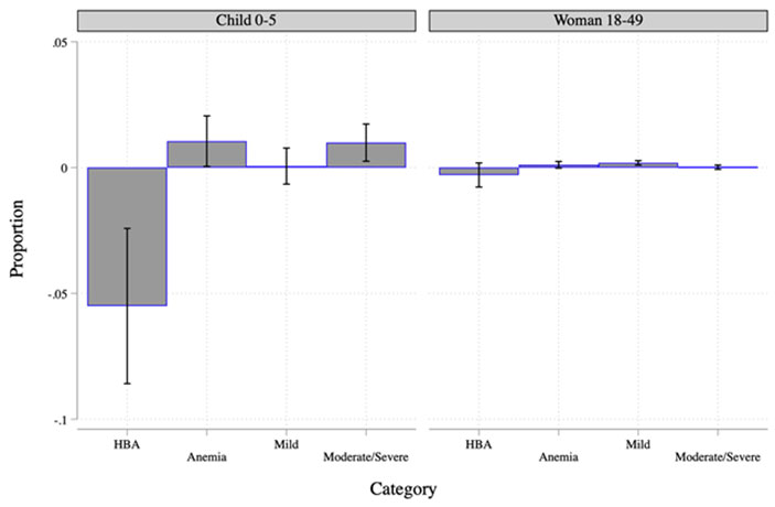 2015-2016 में एकत्र किए गए सबसे हाल के डीएचएस आंकड़ों को सभी बिजली इकाइयों के स्थान और वर्ष के आंकड़ों के साथ मिला कर उपयोग करते हुए हम पाते हैं कि बच्चे के जन्म (जन्म का महीना और वर्ष) के समय पर जिले में कोयला इकाइयों की संख्या और सर्वेक्षण के समय 0-5 वर्ष की आयु के बच्चों के नमूने में एनीमिक होने की संभावना में उल्लेखनीय वृद्धि आपस में जुड़ी हुई हैं। आकृति 3 के बाएं पैनल में ये परिणाम दर्शाये गए हैं। बच्चे के जन्म के समय जिले में एक अतिरिक्त कोयला इकाई स्थापित होने से बच्चों में ऊंचाई समायोजित हीमोग्लोबिन (एचबीए) सांद्रता में लगभग 0.06 ग्राम/डेसीलीटर की एक बड़ी कमी से संबन्धित है, और उसी प्रकार बच्चे के एनीमिक होने की संभावना में एक प्रतिशत की वृद्धि से भी जुड़ा हुआ है। यह देखते हुए कि औसतन इस आयु वर्ग के बच्चे के एनीमिक होने की संभावना 59% है, जन्म के समय जिले में एक अतिरिक्त कोयला इकाई का स्थापित होना इस संभावना को 1.69% बढ़ा देता है। यह आंकड़ा यह भी दर्शाता है कि कोयला संयंत्र इकाइयों के कारण बच्चों पर होने होने वाले एनीमिया प्रभाव मुख्य रूप से मध्यम या गंभीर एनीमिया में वृद्धि के कारण बनते हैं (एनीमिया श्रेणियों के लिए देहली आंकड़ों का विवरण नीचे टिप्पणियों में दिया गया है)। आकृति 3 के दाएं पैनल से पता चलता है कि महिलाओं के लिए एचबीए स्तरों के लिए प्रभाव कमजोर हैं, लेकिन जिले में एक अतिरिक्त कोयला संयंत्र उन महिलाओं के अनुपात में उल्लेखनीय वृद्धि करता है जो कम एनीमिक हैं।