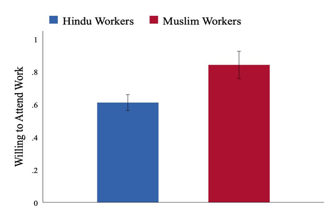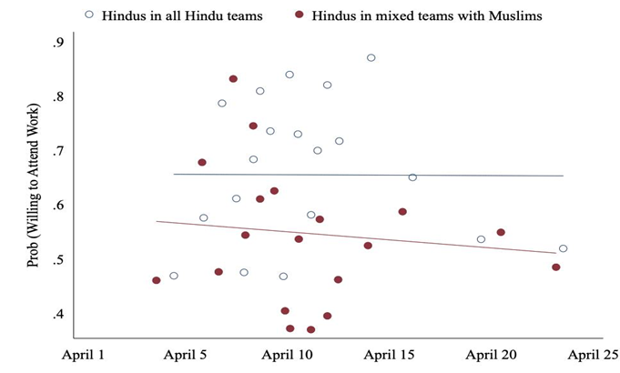 यह देखा जा सकता है कि धार्मिक रूप से सजातीय टीमों में हिंदू श्रमिकों की तुलना में, मुसलमानों के साथ वाली टीमों में काम पर लौटने को इच्‍छुक हिंदू श्रमिकों की संख्‍या काफी कम है। मेरा अनुमान है कि यह अंतर लगभग 11.5 प्रतिशत है।2 सामान्य रूप से हिंदुओं (मुसलमानों के सापेक्ष) में काम करने की कम इच्छा को विभिन्न कारकों द्वारा समझाया जा सकता है, जिसमें बीमारी के बारे में ज्ञान में अंतर, संपर्क का खतरा महसूस करना, कारखाने में खाने और धुलाई के क्षेत्रों को मुस्लिम श्रमिकों के साथ साझा करने की चिंता, आदि शामिल हैं। हालाँकि, इस बात की भी संभावना है कि मिश्रित टीमों में मुस्लिम सहकर्मियों से अधिक निकटता की आशंका के कारण दोनों प्रकार की टीमों में हिंदुओं की प्रतिक्रियाओं में अंतर हो।
