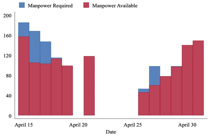 हालांकि इसमें कोई संदेह नहीं है कि श्रमिकों की अनुपस्थिति जनशक्ति की कमी का कारण बनती है और इसलिए यह उत्पादन को नकारात्मक रूप से प्रभावित कर रही है, और चूंकि कई कारक एक साथ बदल रहे हैं, इसलिए इस समय इस नुकसान की मात्रा को निर्धारित करना मुश्किल है। फर्म ने सामाजिक दूरी की नीतियों को अपनाया है जिससे उत्पादन के नकारात्मक रूप से प्रभावित होने की संभावना है क्योंकि अनुपस्थिति के कारण श्रमिकों की टीम में बदलाव होते रहते हैं। फिर भी, आकृति 4 में, मैंने जनशक्ति की कमी की मात्रा का अनुमान लगाने के लिए आवश्यक, जनशक्ति बनाम दैनिक उपलब्ध जनशक्ति को प्रस्तुत किया है।