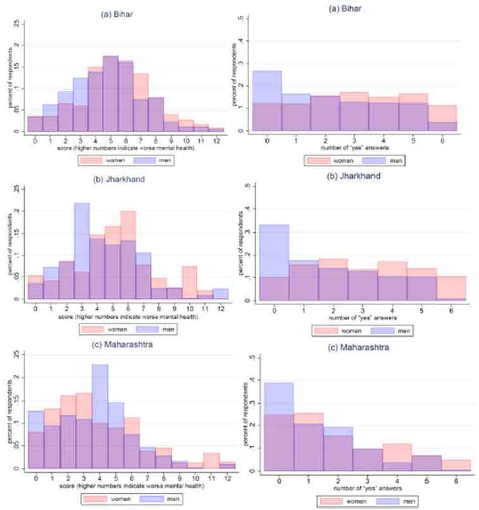 एसआरक्यू और केसलर-6 दोनों मानसिक स्वास्थ्य में क्षेत्रीय विषमताओं की पहचान करने में सक्षम थे - मानव विकास और सामुदायिक अध्ययन में अंतर के अनुरूप - बिहार और झारखंड में लोगों के बीच मानसिक स्वास्थ्य महाराष्ट्र की तुलना में निम्नतर था (गुरुराज एवं अन्य 2016)। हालांकि केसलर-6 की तुलना में एसआरक्यू शिक्षा के कारण असमानताओं की पहचान ज्यादा कर पाया। लैंगिक असमानताओं के संदर्भ में एसआरक्यू पुरुषों की तुलना में महिलाओं के बदतर मानसिक स्वास्थ्य को अधिक स्पष्ट रूप से वर्गीकृत करता है। यह आकृति 1 से स्पष्ट है, जिसमें एक उच्च स्कोर का मतलब खराब मानसिक स्वास्थ्य है। यह बिहार में केसलर-6 के बारे में भी सच है लेकिन झारखंड और महाराष्ट्र के लिए यह अधिक स्पष्ट नहीं है।