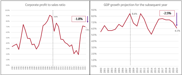 स्रोत : (i) निवेश-बिक्री अनुपात और लाभ-बिक्री अनुपात ‘सेंटर फॉर मॉनिटरिंग इंडियन इकोनॉमी प्रोवेस’ डेटाबेस से लिए गए हैं। (ii) विकास अनुमान विश्व आर्थिक परिदृश्य के विभिन्न अंकों से लिए गए हैं।