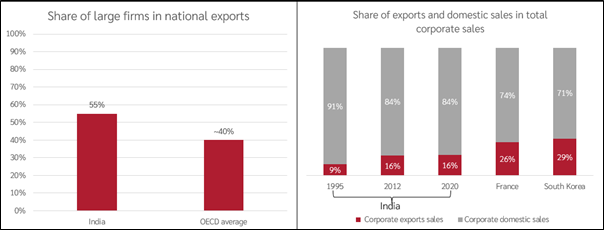 अधिकांश देशों में, बड़ी फर्में निर्यात का प्राथमिक साधन होती हैं, भारत भी इससे अलग नहीं है। भारत के निर्यात का लगभग 55% हिस्सा बड़ी फर्मों के पास है3; यह हिस्सा ओईसीडी देशों (ओईसीडी, 2024) के लिए 40-45% है। हालाँकि, भारतीय फर्मों का लगभग 85% राजस्व घरेलू बाज़ार से आता है, दक्षिण कोरिया (अबे और कावाकामी 1997) जैसे देशों के लिए यह हिस्सा 70% और फ्रांस (बर्मन 2015) के लिए 74% है। चूँकि अंतर्राष्ट्रीय बाज़ार भारतीय फर्मों के लिए असीमित संभावनाएँ प्रदान करते हैं, इसलिए घरेलू बाज़ार की ओर उनका झुकाव वैश्विक बाज़ारों में अधिक गहराई से प्रतिस्पर्धा करने में उनकी अक्षमता के कारण है।
