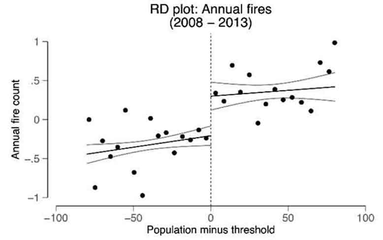 आकृति 3ए जनसंख्या की देहली सीमा पर वार्षिक अग्नि गतिविधि प्रस्तुत करता है। हम देखते हैं कि कार्यक्रम की देहली सीमा से ऊपर के गाँवों में सड़क कार्यों हेतु देहली सीमा से कम जनसंख्या वाले गाँवों की तुलना में आग की संख्या में तेजी से उछाल आता है। हमारे अनुभवजन्य अनुमान बताते हैं कि यह वृद्धि प्रति वर्ष लगभग 2.6 अतिरिक्त आग की घटनाओं तक है (नियंत्रण समूह अर्थात वह समूह जिसे सड़क प्राप्त नहीं हुईं थीं के औसत के सापेक्ष 70% वृद्धि)।