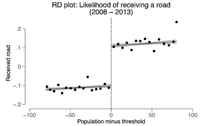 Our analysis focusses on India's flagship rural road construction programme – the Prime Minister's Gram Sadak Yojana (PMGSY) – which facilitated movement of workers away from agriculture. To estimate the impact of rural roads, we leverage the eligibility rules in PMGSY that are based on population thresholds (Asher and Novosad 2020): villages with a baseline population (as per the 2001 Census) just above the specified threshold were more likely to receive a new road under the programme than villages with a population just below the threshold. The fact that the villages on either side of the threshold are, on average, similar in terms of other characteristics, allows us to isolate the causal impact of the roads using a regression discontinuity design (RDD).1