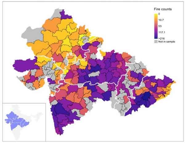 To measure the impact of the roads on fire activity, we use data from NASA's MODIS (Moderate Resolution Imaging Spectroradiometer)-Aqua and Terra satellite systems. These satellites detect infrared radiation associated with biomass fires at a 1-km (kilometre) spatial resolution at a daily level (Csiszar et al. 2006). We aggregate the daily fire-pixels data observed within a 10-km radius around sample villages to the yearly level to use as our main outcome variable. While much of the media and policy attention is focused on stubble-burning in Punjab and Haryana in Delhi's vicinity, satellite data show that crop fires are common across many other parts of the country as well, including the states in our study sample (Figure 2).