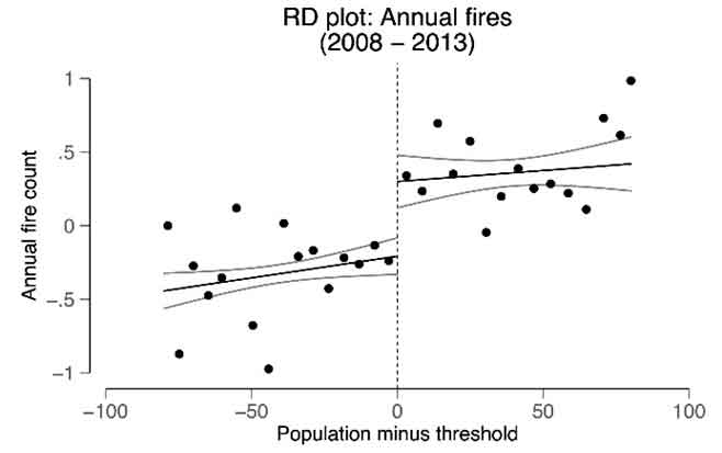 Figure 3a presents the annual fire activity across the population threshold. We see that villages above the programme’s threshold experience a sharp jump in the number of fires relative to villages below the population cut-off for road assignment. Our empirical estimates show that the increase is about 2.6 additional fires per year (a 70% increase relative to the average of the control group – the group that did not receive roads).