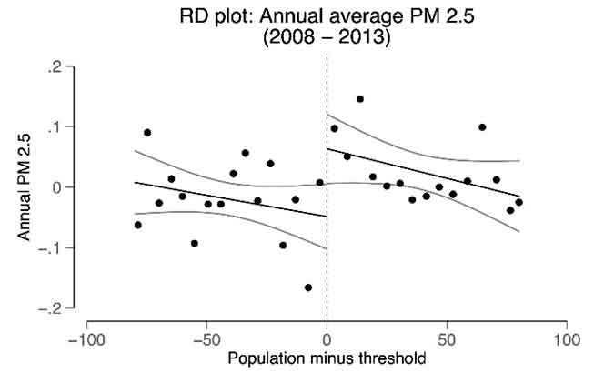 Figure 3b. Annual average PM2.5 around the population threshold, 2008-2013