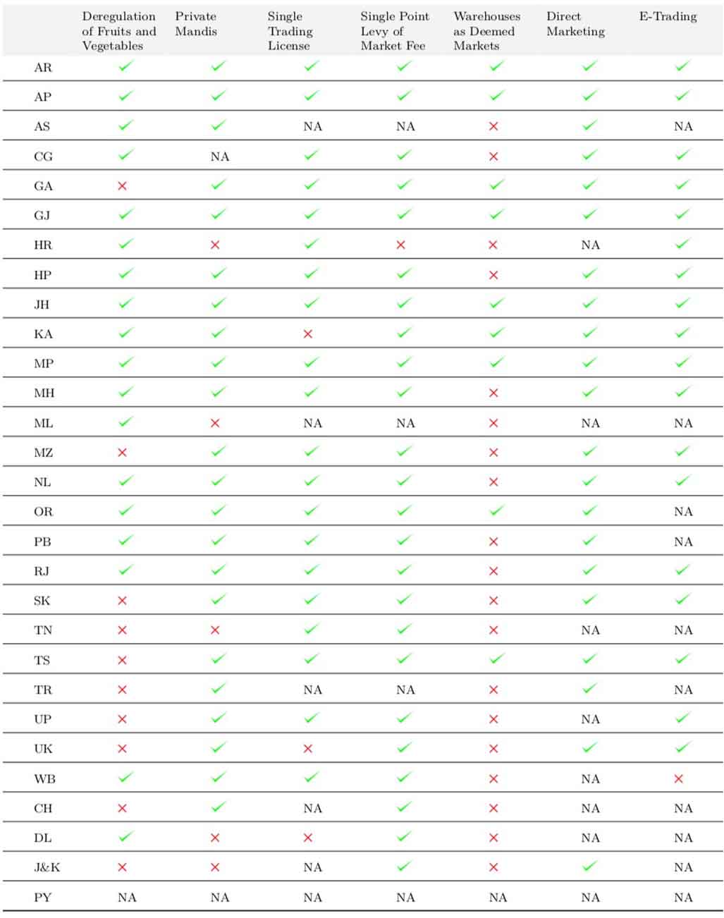 Fourth, recognising the federal nature of the Indian Republic, the central government often proposes model acts to encourage the state governments to adopt or adapt, and to nudge the country towards a common goal. The NDA (National Democratic Alliance) government had prepared a model APMC (Agricultural Produce Marketing Committee), Act in 2003. Since then, 22 states have gradually reformed their APMC laws to allow private mandis (markets). Kerala never had any APMC, and Bihar abolished it in 2006. Also, 18 states have deregulated trade in fruits and vegetables (Table 1). In 2018, the NDA government prepared the model contract farming law. Both these model laws indicate that previous governments at the Centre had considered agriculture to be a state subject under the Constitution.