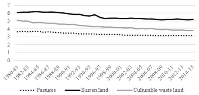 A steady decline in area under CPLRs has been recorded in the country over the last three decades. Using reclassification of land-use statistics, Chopra (2002) assessed area under CPLRs to be 21.6% of India's total geographical area in 1980-81. This area reduced to 15% of total geographical area, with losses ranging between 1-32% across various districts (NSSO, 1999). Statistics for three classifications2 of land that qualify as CPLRs, highlight the continued loss of commons. Pastures and grazing land, barren land, and culturable wasteland were 3.6%, 6.1%, and 5.1%, respectively, of India's total geographical area in 1980, and reduced to 3.1%, 5.2%, and 3.8%, respectively, in 2015 (Figure 1).3 Given the nature and extent of dependence of rural population on CPLRs in India, such erosion of CPLRs has severe implications for rural livelihood strategies.