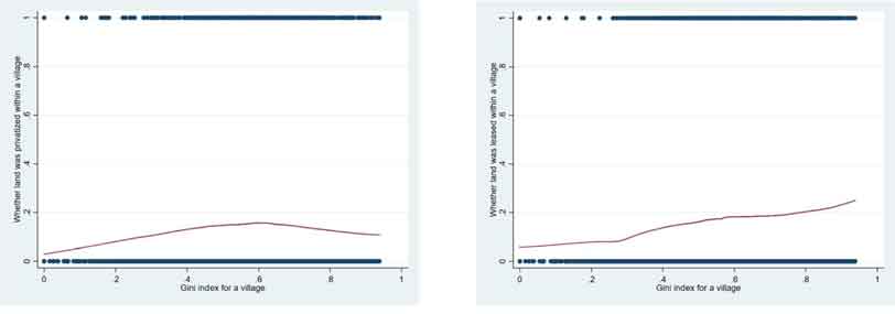 We use the NSSO survey of 1998 on CPLRs in India to establish the causal impact of economic inequality on loss of CPLRs (Thapliyal et al. 2019). This was the first, and so far only, nationally representative survey that provides detailed information on all types of CPLRs in India. A total of 78,990 households were interviewed from 5,115 Census villages across 25 states and seven union territories. The survey consists of two schedules pertaining to CPLRs – the village-level schedule (including detailed information on de jure and de facto rights to access CPLRs) and the household-level schedule (including socioeconomic household characteristics and extent of dependence on CPLRs). Data from these two schedules were merged at the village level to construct our sample of 4,621 villages. In addition to these household- and village-specific characteristics, we also account for social and gender inequalities as well as key district-level characteristics that may influence CPLRs (including historical land rights, rainfall, and agro-climatic zones). Approximately 13% of the villages lost CPLRs to village-level privatisation and 17% of the villages reported long-term lease of land by the State. Preliminary plots show that economic inequality (measured using Gini index based on dispersion of households’ land holding)7 has a non-monotonic8 relationship with privatisation of CPLRs (Figure 2, left panel) and a positive relationship with land leased (Figure 2, right panel).