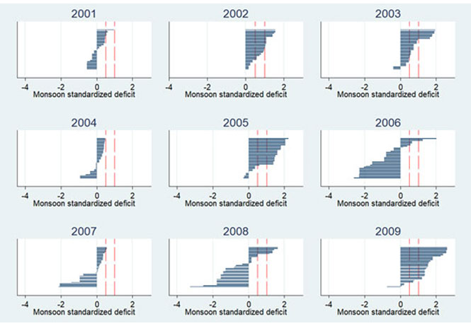 परिवारों के इन आंकडों को ग्लोबल रेन क्लाइमेटोलॉजी सेंटर (जीपीसीसी) से प्राप्त ग्रामीण स्तर पर ऐतिहासिक मासिक वर्षा के आंकड़ों के साथ जोड़ा जाता है। जैसा कि आकृति 1 में दिखाया गया है - समय और स्थान दोनों के अनुसार ही मानसून की वर्षा में बहुत भिन्नता है। मैं एक आघात-सूचकांक का निर्माण करता हूँ, जो गांव में दीर्घकालिक औसत से मानसून की कमी के रूप में परिभाषित किया गया है, जो 0.5 मानक विचलन2 से अधिक है तथा जो औसतन हर तीन साल में एक बार होने वाले (हल्के) सूखे के संगत है।