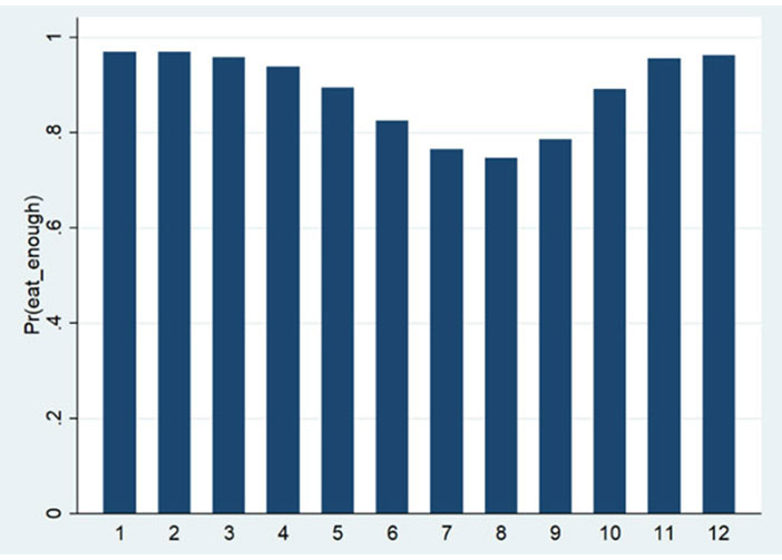 यह देखते हुए कि झारखंड उन भारतीय राज्यों में से है जहां सर्वाधिक भुखमरी और कुपोषण है (मेनन एवं अन्य 2008, भारत-राज्य स्तर बीमारी भार पहल कुपोषण सहयोगी, 2019)। अत: खाद्य सुरक्षा वर्षा के आघातों के तहत परिवारों के कल्याण का एक महत्वपूर्ण आयाम है। आंकड़ों में परिवारों के पास सभी सदस्यों हेतु प्रति वर्ष के दौरान औसतन 10.7 महीनों में रोजाना तीन बार के लिए पर्याप्त भोजन है, जिनमें से 34% कम से कम एक महीने प्रति वर्ष भूख से पीड़ित हैं। जैसा कि आकृति 2 से स्पष्ट रूप से देखा जा सकता है। चावल की अंतिम फसल के बाद से खाद्य सुरक्षा समय के साथ धीरे-धीरे कम हो जाती है, जो जून-सितंबर की अवधि में अपने सबसे निचले बिंदु तक पहुंच जाती है - जो ब्रिज अवधि के संगत है जहां सबसे कठिन आय आघात की संभावना है।
