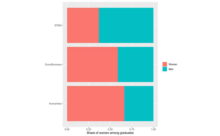 Despite these high returns to studying science, we find that only 39% of women graduates in our survey have STEM degrees, almost half the proportion of men at 68%, while 35% of women graduates study the humanities, more than double the proportion of men at 16% (Figure 1b). We turn next to explaining the low enrolment of women in STEM and economics degrees.