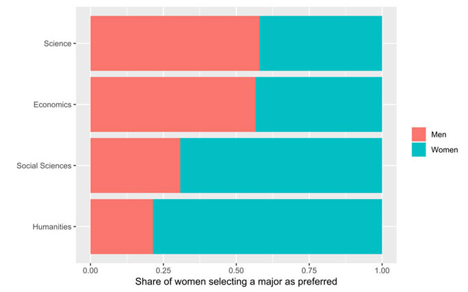 Figure 2 below shows substantial gender differences in the ranking of college majors. More than half of the women prefer a major in social science or the humanities, compared to 26% of men. Correspondingly, three quarters of the men prefer a major in science or in economics.