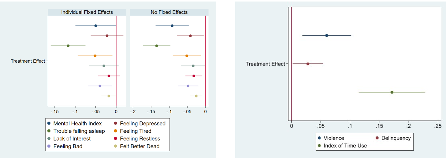 After the complete, unannounced ban on the production, sale and consumption of alcohol, we find that the mental health outcomes of adolescents worsened (by 0.09 standard deviations1 relative to the control group. The probability of  extreme mental health conditions like thoughts of death and depressive symptoms see an increase of 2.6% and 4.2%  after the ban. Those affected were 13.5% more likely to have trouble falling asleep, in addition to 5.2% higher likelihood of exhaustion and 3.2% of restlessness.