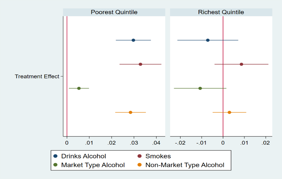 The ban also had a differential impact by household wealth of adolescents. The poorest income groups faced the brunt of the ban in terms of deterioration in mental health and were 3% more likely to consume alcohol. The increase in alcohol consumption for the poor can be attributed mostly to non-market sources, potentially more harmful than legal forms of alcohol. In contrast, the richest individuals had no significant change in alcohol consumption and no change in the source of alcohol, suggesting that the ban did not change alcohol-specific behaviour for this group.
