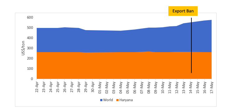 The ban on wheat exports led to depressed domestic wheat prices. For instance, Figure 3 shows that from 22 April to 12 May, that is, before the ban, prices in the international market were, on average, US$ 498 per tonne, as compared to domestic market price (for instance, in the state of Haryana) averaging US$ 263 per tonne. After the imposition of the ban on exports from India, international prices began rising significantly, to US$ 545, US$ 570, and US$ 576 per tonne, well over the pre-export ban price of US$ 518 per tonne on 12 May, and are continuing to rise.
