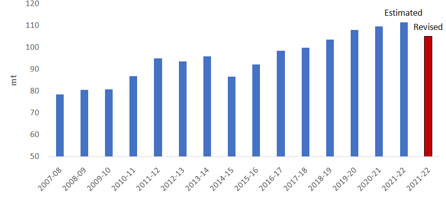 India is the second largest producer of wheat in the world and accounts for around 14.1% of global wheat production1. The country is gradually emerging as a global supplier of wheat, which is evident from recent exports of wheat to the tune of 7.85 million tonnes up to March in Financial Year (FY) 2021-22, an all-time high and a sharp increase from 2.1 million tonnes in the previous year (FY2020-21). In February 2022, as per Second Advance Estimates of the Government of India, it was expected that India would set a new record of producing 111.32 million tonnes of wheat. However, this was subsequently revised downwards to the extent of 105 million tonnes for the 2021-22 crop year (see Figure 1).