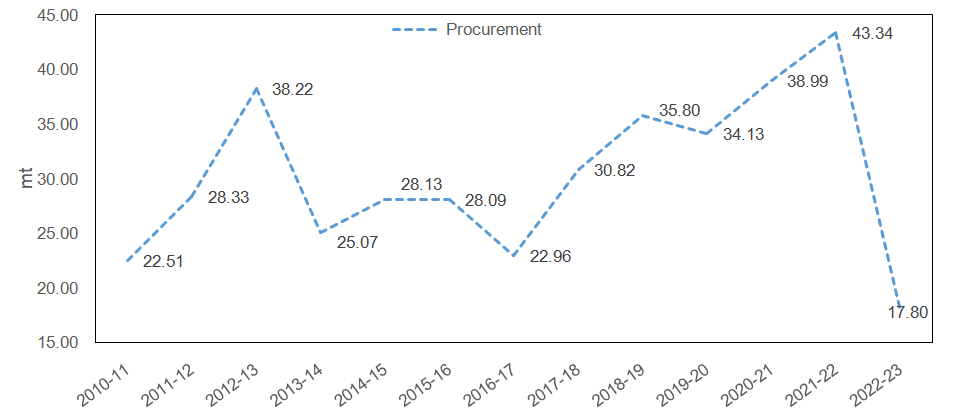 However, declining wheat yield due to the sudden rise in temperature has affected government procurement, as well as India’s ambitious export plan, in favour of ensuring food security within the country. Until 10 May 2022, the government had procured 17.8 million tonnes of wheat, which was around 59% less than the previous year’s purchase (43.34 million tonnes) and roughly 60% less than the expected purchase target for FY2022-23 (see Figure 2).