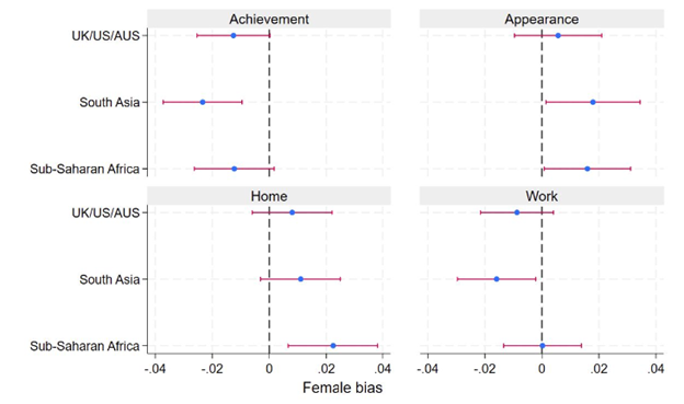 India is among the worst countries in the world on the World Economic Forum’s gender gap index, ranking 129th in 2024. Our previous research (Crawfurd, Saintis-Miller and Todd 2024) has shown that South Asia, and India in particular, is the worst region in the English-speaking world for stereotypes and low representation of women and girls in schoolbooks. Figure 1 below shows the association in textbooks between gendered words and words related to achievement, appearance, home, and work (examples include text linking mothers to cooking, and assuming doctors are male). Books from South Asia have the strongest male bias in relation to language around achievement and work, and the strongest female bias in relation to language around appearance, relative to books from the UK, US, Australia, and Sub-Saharan Africa.