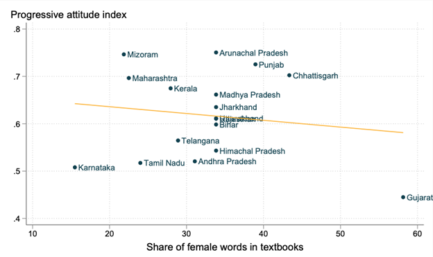 Source: Data for the attitude index is from the 2022 Pew Survey “How Indians View Gender Roles in Families and Society”. The authors are grateful to Pew for sharing the microdata along with the geographical identifiers, allowing the creation of this index. The index is the principal component of seven survey questions; related to gender roles and (i) job rights, (ii) earnings, (iii) spending, (iv) inheritance, (v) raising kids, (vi) marital relations, and (vii) political leaders. Data on the share of female words in textbooks are from authors’ analysis of textbooks.
