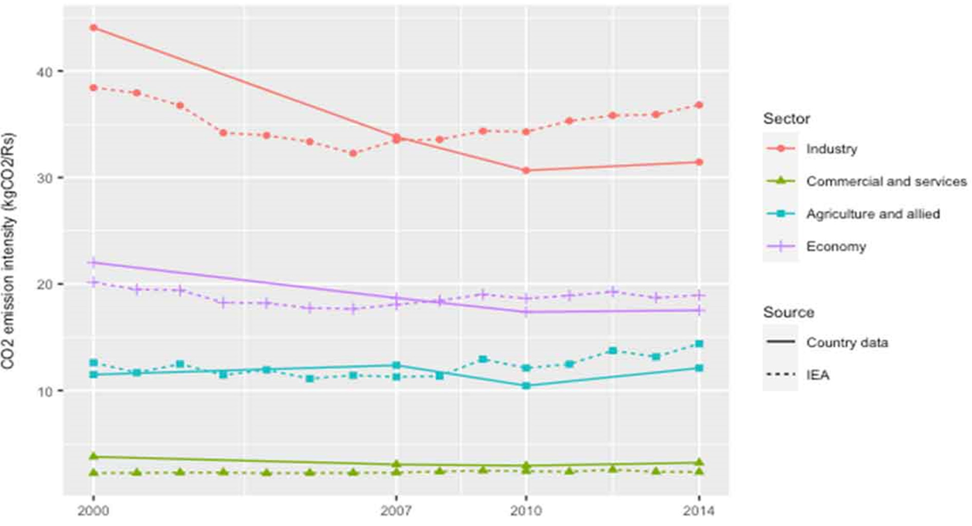 चित्र 1 वर्ष 2000-2014 की अवधि के दो डेटा स्रोतों से गणना की गई CO2 उत्सर्जन तीव्रता को इंगित करता है। वर्ष 2007 को छोड़कर सभी वर्षों में दोनों स्रोतों के अनुमान काफी भिन्न हैं। आईईए के आंकड़ों के अनुसार, वर्ष 2005 से 2014 तक भारत की CO2 उत्सर्जन तीव्रता में 7% की वृद्धि हुई है। चूंकि देश में रिपोर्ट किए गए स्रोतों से वर्ष 2005 का डेटा उपलब्ध नहीं हैं, इसलिए मैंने तुलना के लिए वर्ष 2007 के डेटा का उपयोग किया है। देश में रिपोर्ट किए गए आंकड़ों के अनुसार, वर्ष 2007 और 2014 के बीच भारत की CO2 उत्सर्जन तीव्रता में 6% की गिरावट आई है। इसके विपरीत,आईईए डेटा इसी अवधि के दौरान इसी मूल्य में 5% की वृद्धि दर्शाता है। आईईए के आंकड़ों के अनुसार, वर्ष 2005 और 2014 के बीच और वर्ष 2007 और 2014 के बीच सभी क्षेत्रों में उत्सर्जन की तीव्रता में वृद्धि हुई है। तथापि, वर्ष 2007-2014 के दौरान देश में रिपोर्ट किए गए डेटा में उद्योग और कृषि और संबद्ध क्षेत्रों की उत्सर्जन तीव्रता में गिरावट नजर आती है।