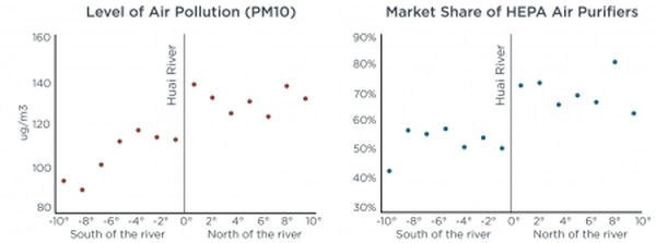 Our assumption going into this was that if people value clean air, then they would buy air purifiers that would effectively reduce indoor air pollution. And, those experiencing the worst pollution would buy more of them. To prove this, we collected data on monthly air purifier sales, monthly average prices paid and detailed product attributes such as effectiveness in reducing pollution for purifiers sold in retail stores in 81 Chinese cities - both north and south - from January 2006 through December 2012. We also collected pollution data from monitors and demographic information from the Chinese census.