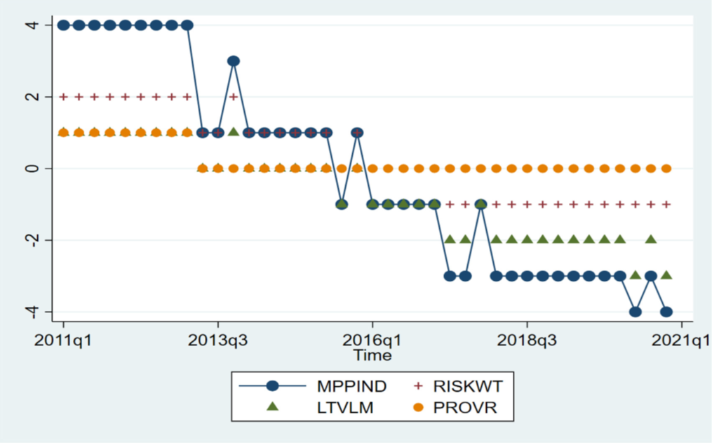 Note: MPPIND refers to the aggregate Macroprudential Policy Index, whereas LTVLM, RISKWT & PROVR are the loan-to-value limits as per the size of the loan, the associated risk weights, and provisioning requirements, respectively.