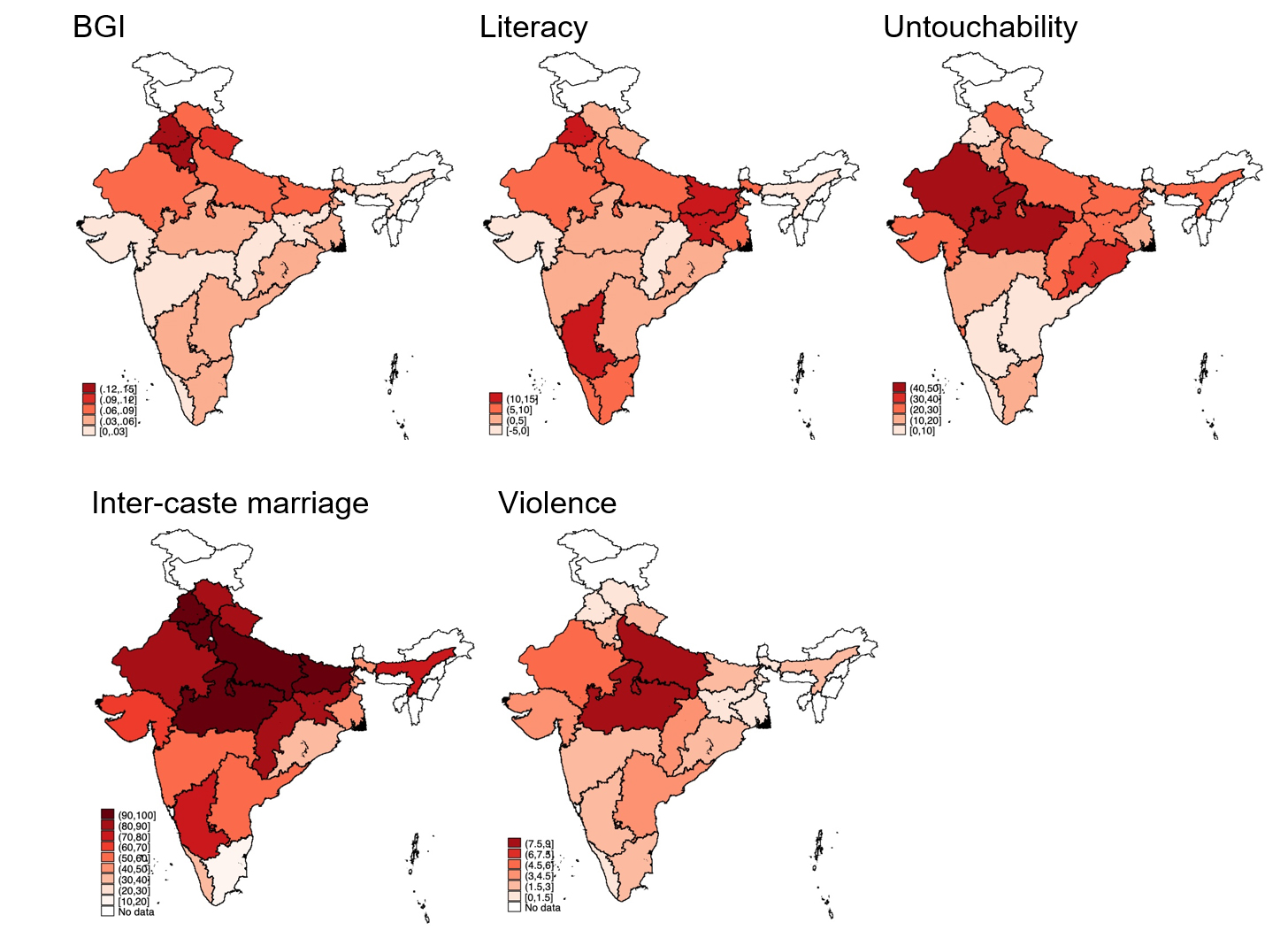 Although recent research on inequality shows that upper castes have the highest levels of material well-being, there is a wide variation in caste inequality across India. Measuring three forms of caste inequality – outcome (income), opportunity (literacy), and status (inter-caste marriage, untouchability, and crime) – this article finds that state rankings depend on the indicator considered. There is, however, a clear north-south divide.