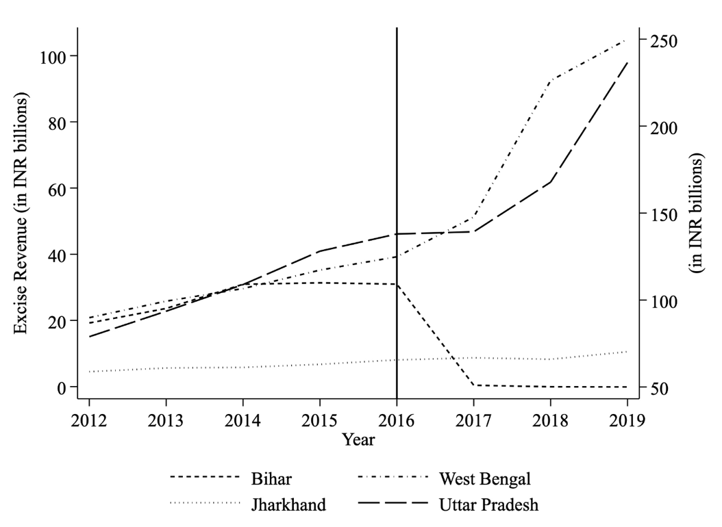 In April 2016, the state government in Bihar implemented a complete state-wide prohibition on the sale, purchase, consumption, and manufacture of alcohol.1 Using data from the Combined Finance and Revenue Accounts of the Union and State Governments for different years, we plotted the revenue generated from sales of various types of alcohol in Bihar and its neighbouring states in Figure 1. As expected, we observe a sharp fall in excise revenue for Bihar post-2016, indicating that the ban was indeed effective in reducing the legal sale and consumption of alcohol across the state (Chaudhuri et al. 2023).