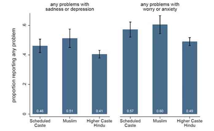 दोनों रणनीति के अनुसार परिणामों में एससी और मुस्लिम उत्तरदाताओं का मानसिक स्वास्थ्य उच्च जाति के हिंदू उत्तरदाताओं (आकृति 1) की तुलना में निम्न था। पिछले महीने में लगभग 41% उच्च जाति के हिंदू उत्तरदाता, 46% अनुसूचित जाति के उत्तरदाता, और 51% मुस्लिम उत्तरदाताओं ने स्वयं को थोड़े, मध्यम, गंभीर या अत्यंत उदास होने की सूचना दी। उच्च जाति के हिंदू उत्तरदाता में आधे से कम, अनुसूचित जाति के 57% उत्तरदाता और मुस्लिम समुदाय के 60% उत्तरदाताओं ने पिछले महीने में चिंता को महसूस किया।