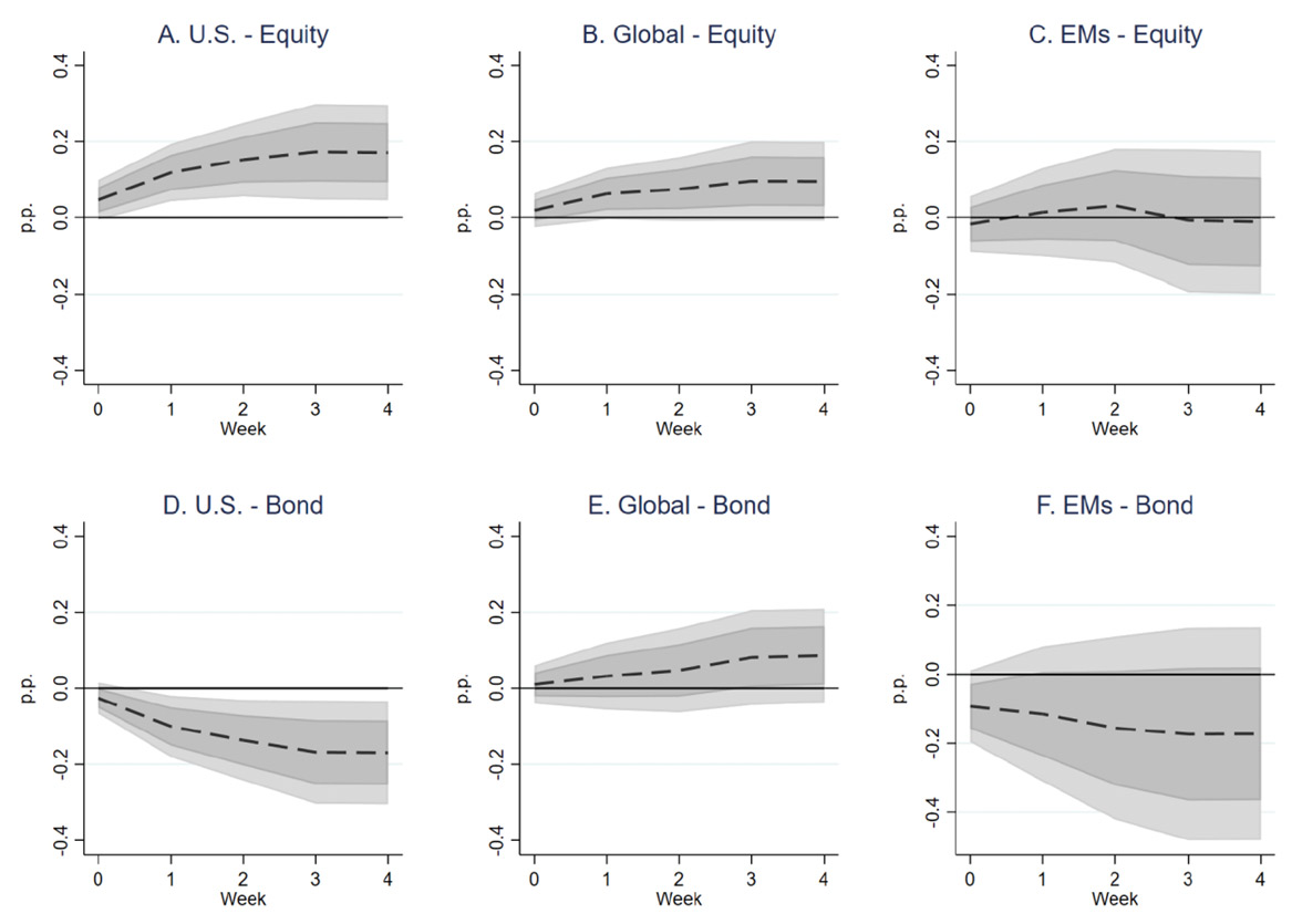 On the other hand, information shocks have distinctly different effects. As displayed in Figure 2, a positive shock, indicating higher interest rates against the backdrop of a better economic outlook, does not cause outflows from EM funds, and leads investors to reallocate capital out of safe US bond funds and into growth-sensitive US and global equity funds.