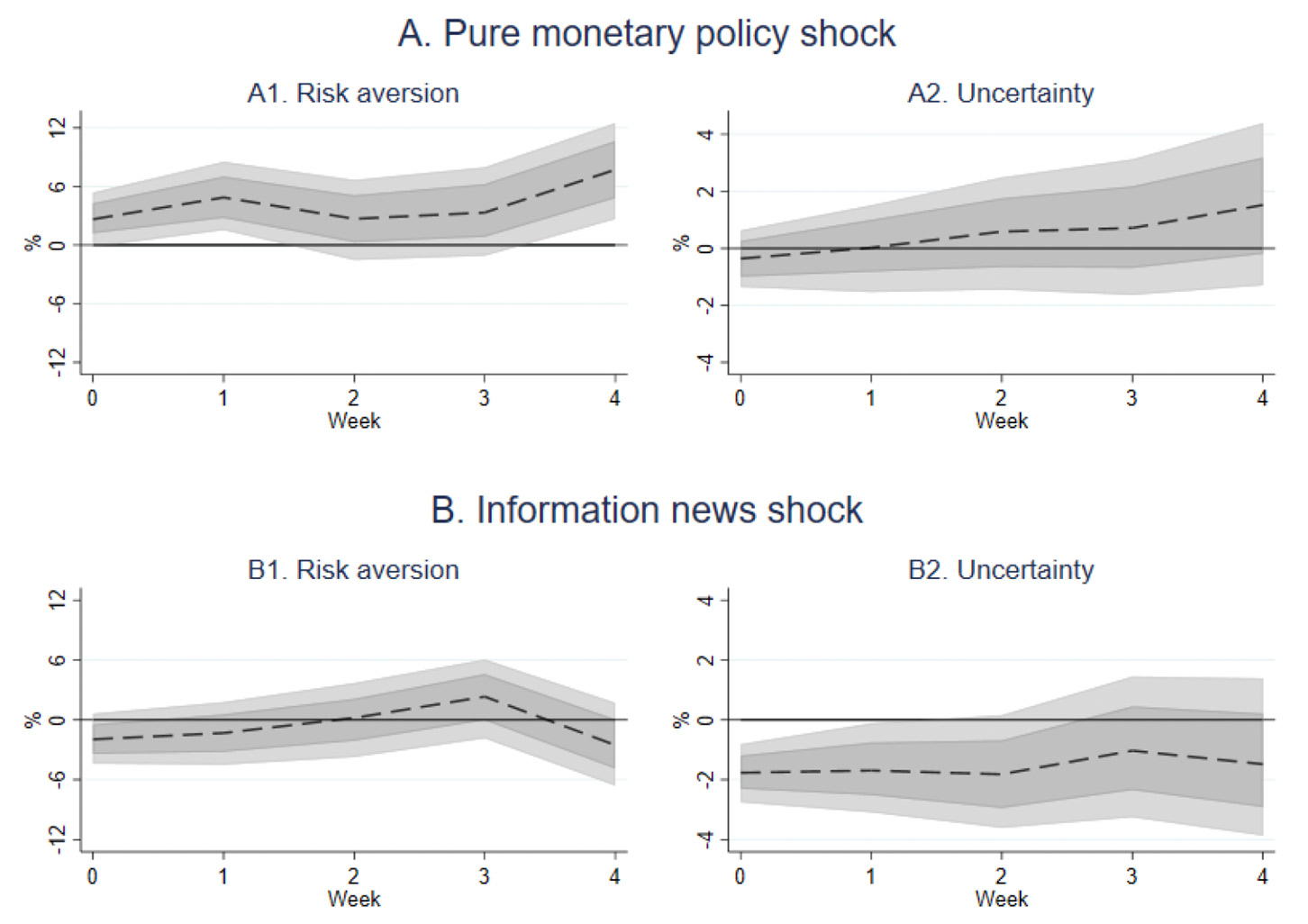 Notes: i) The figure reports the effect of a 10-basis-point pure monetary policy and information news shock on risk aversion and uncertainty. ii) Dashed black lines report point estimates. iii) Deep and shallow grey areas are 90% and 68% confidence bands. iv) X-axes denote the response horizon (in weeks), with 0 being the week of the shock. v) Y-axes denote the magnitude of the response (in percentage points of fund assets).