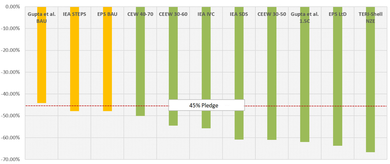 Three of these projections (yellow bars highlighted in Figure 2) can be interpreted as ‘reference’ scenarios, as they represent a continuation of trajectories that incorporate decarbonisation policies and targets as of 2018-2020. The remaining eight are designed to represent scenarios based on additional policies that suggest possible pathways towards full decarbonisation in the second half of the century. The 45% intensity pledge appears to be consistent with the current policy framework reflected in the three reference scenarios here.
