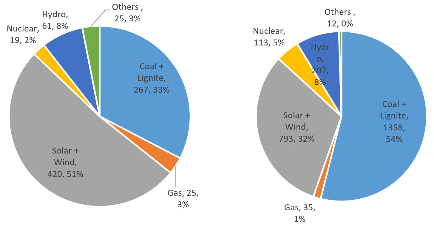 Figure 4. Projected technology mix of electricity capacity and generation as the share of generation capacity (GW, percentage share) (left) and share of gross generation (Terrawatt hour, percentage share) (right) in FY2029-30