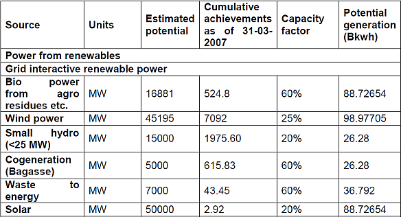 The most important application for new alternative energy resources, such as wind, solar, micro-hydel, biomass and waste, is in the area of electric power generation. Wind energy, solar thermal as well as solar photovoltaic electric energy (that which comes from solar radiation)have substantial potential in India as shown in Table 1. Wind power can be generated from the energy potential of on-shore wind flow on a cost-competitive basis, but only at a low-load factor of about 20%. Solar thermal energy, on the other hand, is an economically feasible option mainly for water heating. The solar photovoltaic power is still a high-cost option, with cost per unit being in the range of Rs. 15 to 20/kwh. However, the development of solar thermal power involving the use of high temperature collectors with mirrors and lenses, and steam turbine is underway and could add substantial potential power generation in the future. Table 1 shows the estimated potential of power capacity and the cumulative achievement of installation as of 31 March 2007 as per India’s ‘Eleventh Five Year Plan’ document along with alternate assessments obtained from other sources, which can be used for realistic energy planning in the medium to long run.