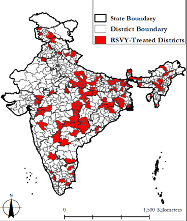 RSVY had a transparent allocation procedure that was explicitly documented by the Government of India. The eligibility of districts under RSVY, was based on a two-step process. In the first step, the central government determined the number of treatment districts that would be assigned to each of the 17 major Indian states. The quotas were worked out on the basis of state-level prevalence of poverty. In the second step, each state government, in accordance with the assigned quota, chose the specific districts to allocate the RSVY grants. The selection was based on an existing development ranking known as the ‘Backwardness Index’. This ranking index was public information, and a composite level of districts’ economic underdevelopment was constructed from three historical parameters with equal weights: (i) value of output per agricultural worker (1990-1993); (ii) agriculture wage rate (1996-1997); and (iii) districts’ percentage of low-caste populations — Scheduled Castes/Scheduled Tribes (1991).
