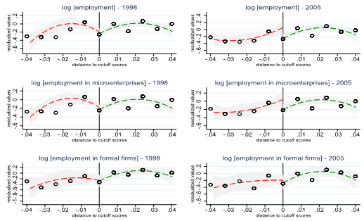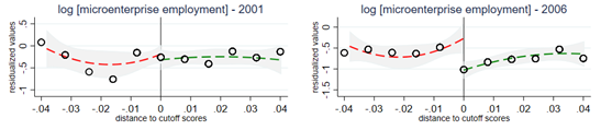 We find a number of results on the effectiveness of RSVY in the short run. First, we find that overall village employment in RSVY districts increased by 11% relative to control districts. This was driven entirely by village employment in microenterprises, with no effect on employment in formal firms. In Figure 2, the left-hand panel shows village-level employment before RSVY (in 1998) and the right-hand panel shows village-level employment after RSVY (in 2005).