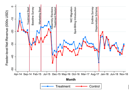 Through a randomised controlled experiment conducted in eight districts of Bihar, Sudarshan et al. aim to understand how to minimise losses through improved rationing of power supply. Two groups were assessed ─ a ‘control’ group where the supply is uniform across all areas and a ‘treatment’ group where supply is based on their revenue performance. Following graph exhibits the results of the study which imply that revenues generated from the treatment group were higher than that from the control group, except during the time of assembly election and at the dispensation of the scheme. With the implementation of this idea/project, some increase in revenue of the distributors is found since electricity is sent to the right people.