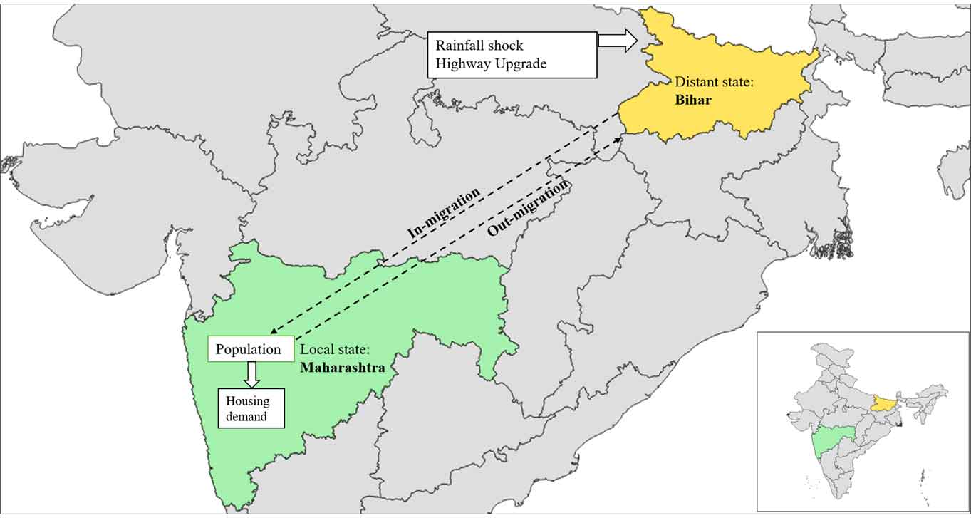 Notes: (i) The map presents a snapshot of the central part of India with the ‘local state’ of Maharashtra and the ‘distant state’ of Bihar highlighted. (ii) Negative rainfall shocks and highway upgradation occurs in Bihar. The resulting inter-state migration affects housing demand in Maharashtra through changes in the urban population growth of Maharashtra.