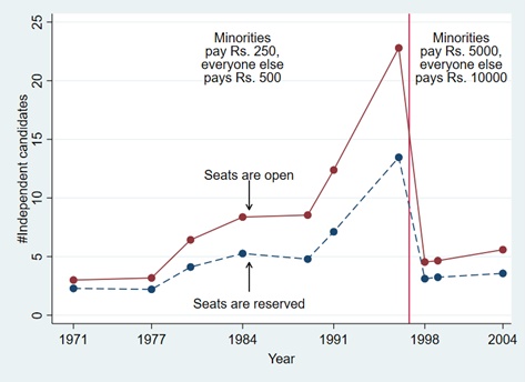The effect on the participation of independents is illustrated in Figure 1. The blue dots represent the average number of independents in reserved constituencies for each Lok Sabha election that took place between 1977 and 2004. The red dots do the same but for independents in open constituencies. The figure shows independent participation was on the rise everywhere leading up to the 1996 reform, that there was sharp decline in their participation following the reform, and that the decline was more pronounced in open constituencies. The relative decline induced by the disproportionate fee increase is what we exploit to recover the causal effects of independents on electoral outcomes.