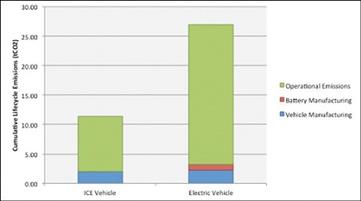 They show that manufacturing an EV results in higher emissions relative to an ICE vehicle, primarily due to the materials and fabrication of the Li-ion battery used in an EV. Thus, producing a mid-sized EV result in up to 1.6 times the emissions compared to a similar sized ICE vehicle. The industry is endeavouring to reduce the manufacturing emissions for EVs in the following ways: