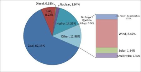 As discussed previously, the emissions in EVs are simply transferred from the tailpipe to the power plant that generates the electricity to charge the battery packs. Hence, the souce of power generation is critical. Essentially, the cleaner the power supply source, the lesser the emissions associated with the EVs. Figure 1 shows India’s power supply mix based on the current installed capacity (Central Electricity Authority, March 2016). Figure 2 shows the global warming pollution intensity of electricity generation by fuel type (Anair et al. 2012).