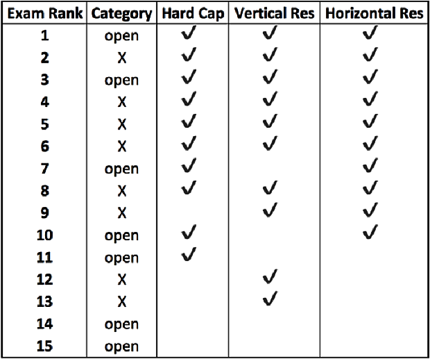 In Table 1, a hard cap unfairly implies a category-X cutoff of rank 8, above the open category cutoff of rank 11. This constitutes the basis for our intuitive objection that this system allows the possibility of reverse discrimination against category-X individuals performing well.